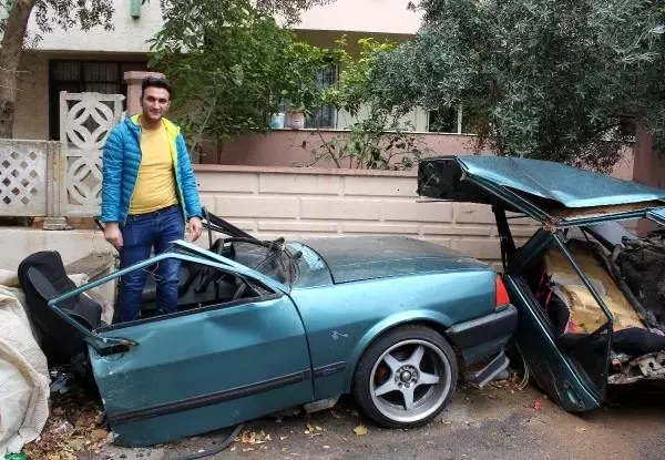 Antalya'nın Konyaaltı ilçesinde, çarpışma sonucu ikiye ayrılan otomobilin yola savrulan sürücüsü Ümit Pamukçu (21), aracın hurdasını evinin önünde tutuyor. Pamukçu, aracı gördükçe kazanın aklına geldiğini ve daha dikkatli otomobil kullandığını söyledi.