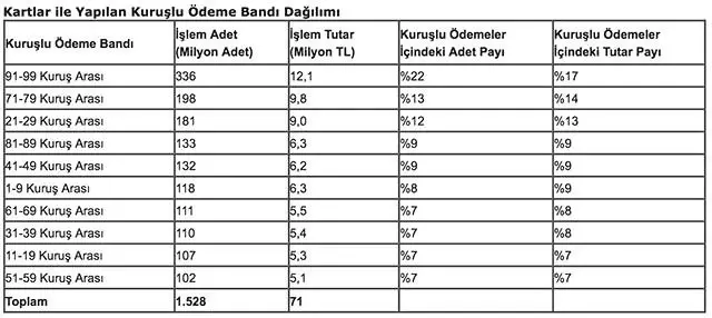 Kuruşlu ödemelerde en fazla işlem adedinin 336 milyon adet işlem ve yüzde 22 pay ile 91-99 kuruş aralığında olduğu görülüyor. 198 milyon adet işlem ve yüzde 13 pay ile 71-79 arası aralığı kuruşlu ödemeler ikinci sırada yer alırken, 181 milyon adet işlem ve yüzde 12 pay ile 21-29 arası kuruşlu ödemeler ise en fazla kuruşlu ödemenin yapıldığı üçüncü aralık olarak ön plana çıkıyor.