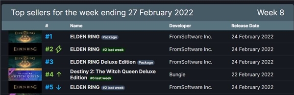 21-27 Şubat tarihlerini kapsayan listede ilk 5 arasında 4 sırayı elde etti. Aşağıdaki tablodan da görebileceğimiz üzere ilk 5'e Elden Ring dışında yalnızca Destiny 2: The Witch Queen Deluxe Edition girdi. Çok satanlar listesini tam anlamıyla domine eden Elden Ring'in bu listeden uzunca bir süre düşmeyeceği belli oluyor.