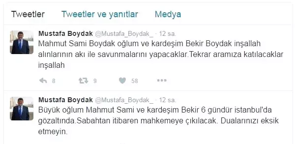 "Büyük oğlum Mahmut Sami ve kardeşim Bekir 6 gündür istanbul'da gözaltında. Sabahtan itibaren mahkemeye çıkılacak. Dualarınızı eksik etmeyin. Mahmut Sami Boydak oğlum ve kardeşim Bekir Boydak inşallah alınlarının akı ile savunmalarını yapacaklar. Tekrar aramıza katılacaklar inşallah."