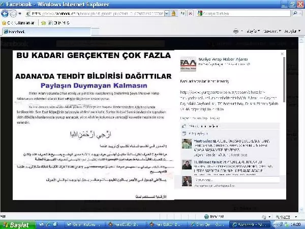 CHP Adana Milletvekili Ümit Özgümüş, Adana'da özellikle Alevi vatandaşların ev ve işyerlerine cihat çağrısı yapan ve Suriye Devlet Başkanı Beşar Esad'a destek verenlerin başının gövdesinden ayrılacağı yönünde tehditler içeren Türkçe ve Arapça yazılı bildiriler dağıtıldığını iddia etti. Adana Valisi Hüseyin Avni Coş, bildirileri dağıtanların birkaç kişi olduğunu, amacın vatandaşlar arasında huzuru bozmak olduğunu söyledi.