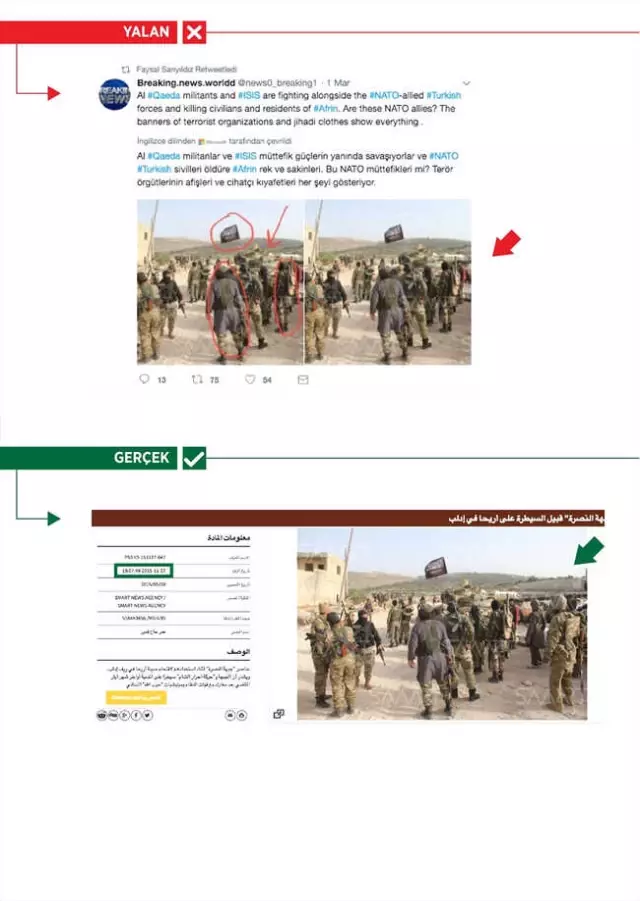 Terör örgütü PYD/PKK destekçilerinin sosyal medyada, Türk Silahlı Kuvvetlerinin (TSK) Afrin'de yürüttüğü Zeytin Dalı Harekatı'nı karalamak için paylaştığı iki fotoğrafın daha gerçekle ilgisi olmadığı belirlendi.