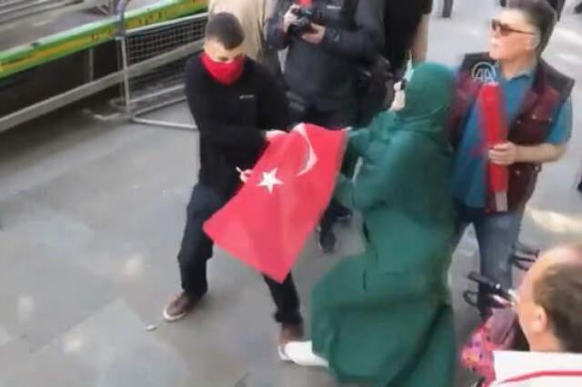 PKK'lıların gösterisi sırasında Türk bayrağını teslim etmeyen, İngiliz polisinin önünden çekip alan kadını arayan Erdoğan, "Sen bu asrın nene Hatunu'sun, Şerife Bacı'sısın" dediğini anlattı.
