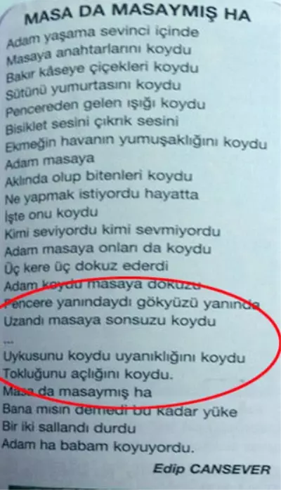 Edip Cansever'in "Masa da Masaymış Ha" şiiri, 12. sınıflarda okutulan ders kitabında sansürlendi.