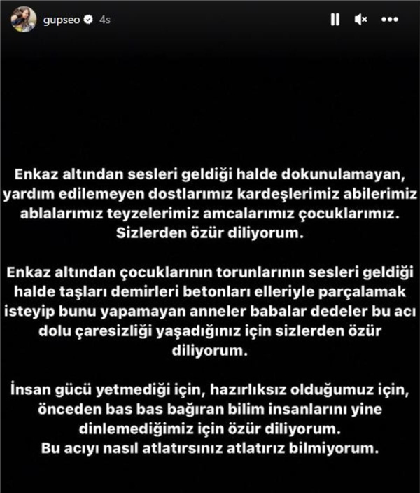 "Enkaz altından sesleri geldiği halde dokunulamayan yardım edilemeyen dostlarımız, kardeşlerimiz, abilerimiz, ablalarımız, teyzelerimiz, amcalarımız, çocuklarımız sizlerden özür diliyorum.