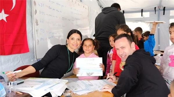 Yonca Evcimik, İrem Derici, Atakan Işıktutan ve Özgür Aras Maraş merkezli depremlerden kurtulan çocukları ÇOHAV (Çocuk Hastalıkları Araştırma, Önleme ve Tedavi Vakfı) nın organizasyonu ile Hatay'da 11 ilde açılan ilk Defne Orhanlı Çadır Kent Okulu'nu ziyaret ettiler.
