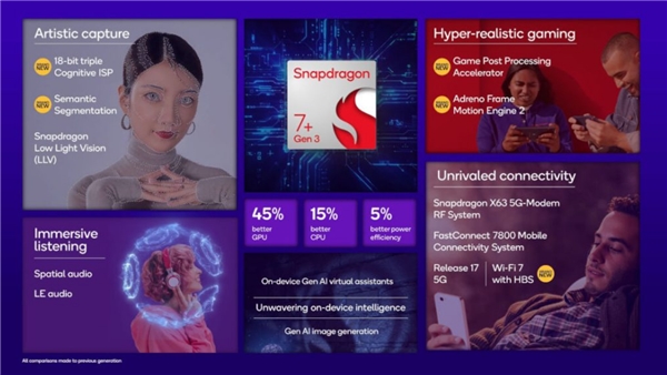 Qualcomm'un yeni işlemcisi, Snapdragon 8 serisinde bulunan birincil Cortex-X4 çekirdeğine sahip olduğundan güç vereceği telefonlara en yeni yapay zeka yeteneklerini getirerek kullanıcılara daha üstün performans sunmayı hedefliyor. Ayrıca şirket tarafından yapılan duyurulara göre Snapdragon 7+ Gen 3, önceki versiyonlarına göre sırasıyla yüzde 15 ve yüzde 45 daha fazla CPU ve Adreno grafik performansı sunuyor.