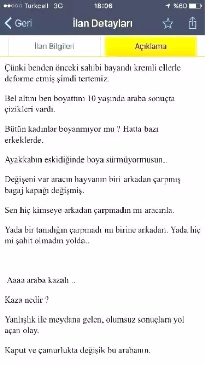 İlanda arabanın özelliklerini sıralayan Acar, arabanın bir önceki sahibinin kadın olduğunu hatırlatarak, "Direksiyon şimdi yeni. Çünkü benden önceki sahibi bayandı. Kremli ellerle deforme etmiş. Şimdi tertemiz. Bel altını ben boyattım. 10 yaşında araba sonuçta, çizikleri vardı. Bütün kadınlar boyanmıyor mu? Hatta bazı erkekler de. Ayakkabın eskidiğinde boya sürmüyor musun? Değişeni var aracın. Hayvanın biri arkadan çarpmış, bagaj kapağı değişmiş. Sen hiç kimseye arkadan çarpmadın mı aracınla? ya da bir tanıdığın birine çarpmadı mı arkadan? ya da hiç mi şahit olmadın yolda? 'Aaa araba kazalı.' Kaza nedir? Yanlışlıkla meydana gelen, olumsuz sonuçlara yol açan olay. Her araba gibi bu da nazlıdır. Sağından solundan ses duyarsan sanayiye götür. Sana söylemeye çekinir belki ama ustaya anlatıverir derdini. Eğer alırsan bu aracı, ona iyi bak. Bakıma alışmış çünkü" sözlerine yer verdi.