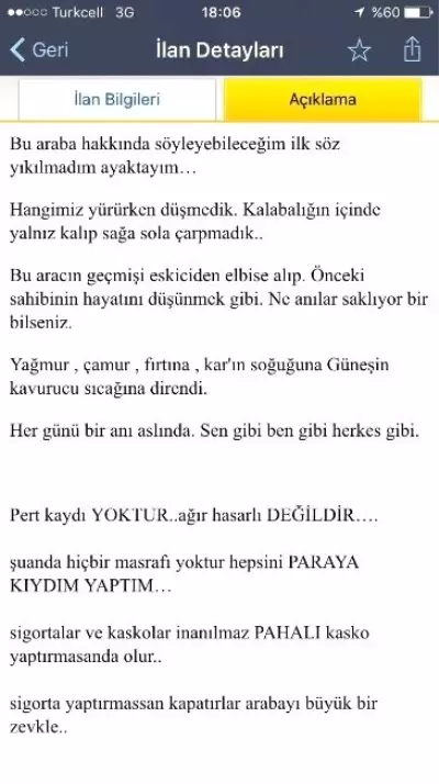"Hangimiz yürürken düşmedik? Kalabalığın içinde yalnız kalıp sağa sola çarpmadık? Bu aracın geçmişi, eskiciden elbise alıp önceki sahibinin hayatını düşünmek gibi. Ne anılar saklıyor bir bilseniz. Yağmur, çamur, fırtına, karın soğuğuna; güneşin kavurucu sıcağına direndi. Her günü bir anı aslında. Sen gibi, ben gibi, herkes gibi. Pert kaydı yoktur, ağır hasarlı değildir. Şu anda hiçbir masrafı yoktur. Hepsini paraya kıyıp yaptım. Çok uzun anlatmayacağım satırlarla. Çok merak edersen ama, arabanın yanında anlatırım geçmişinin izlerini sana. Sakın sağda solda bu konuyu paylaşma. Araba darılır sonra sana bana."
