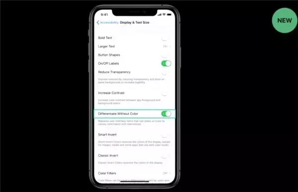 Mac'ten iOS cihazlara getirilen bu ayar, 'Renk ile farklılaştırma' adı verilen renk körü kullanıcılar için geliştirildi. Bu özellik, Erişilebilirlik ayarlarındaki 'Ekran ve Metin Boyutu' seçeneğinden aktifleştirilebilecek. Bu özellik, kullanıcı arayüzünde sadece renklere dayanan elementlerin renklerini daha fark edilebilir olanlarla değiştirilecek.