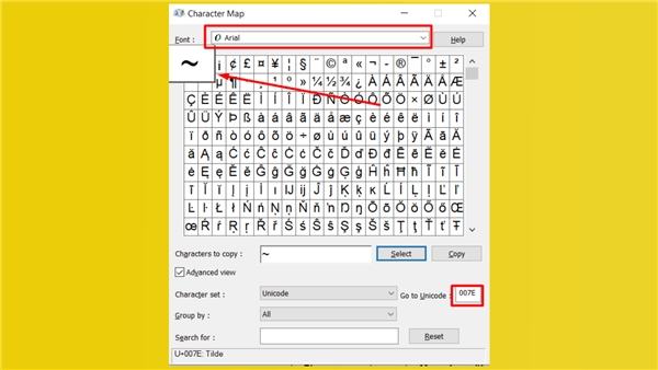 "Karakter Kümesi" seçeneğini "Unicode" olarak değiştirin. Son olarak yanındaki arama kutusuna "007E" yazın ve Enter tuşuna tıklayın. Yaklaşık işaretini bulduktan sonra üzerine tıklayarak kopyalayabilirsiniz.