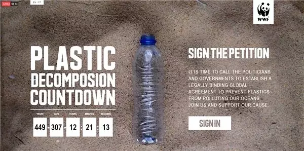 Dünya Doğayı Koruma Vakfı, ciddi boyutlara ulaşan plastik kirliliğine dikkat çekmek için 450 yıl sürecek bir canlı yayın başlattı. Başlatılan canlı yayında plastik bir şişe kum üzerinde gösteriliyor.