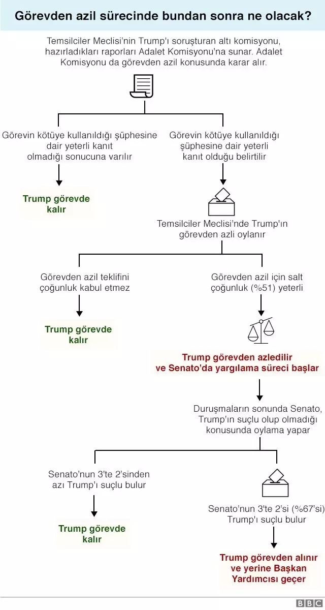 "Temsilciler Meclisi'nden geçmesi için basit çoğunluk yeterli. Demokratlar Kongre'nin bu kanadında çoğunlukta oldukları için iddia edilen ağır suç ve uygunsuz davranışları kanıtlayabilirlerse Cumhuriyetçi başkan hakkında Temsilciler Meclisi'nden azil kararı çıkacağına kesin gözüyle bakılabilir."