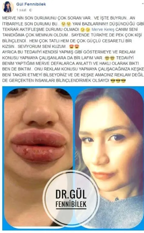 Silikon mağduru Keleş'in doktoru uyguladığı tedavi yöntemiyle, düzelmesi zor ve riskli olan dudağı eski haline döndürmeyi başardı. Bu başarısını da sosyal medya hesabından paylaşarak, "Merve'nin son durumunu çok soran var. İşte buyurun an itibariyle son durumu bu. Yani bazılarının düşündüğü gibi tekrar aktifleşme durumu olmadı" ifadelerini kullandı.