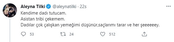 Genç şarkıcı, iş hayatında asistan yerine "dadı"yla çalışmaya karar verdiğini yazdı: "Kendime dadı tutacağım. Asistan tribi çekemem. Dadılar çok çalışkan. Yemeğimi düşünür, saçlarımı tarar ve her şey." Aleyna Tilki'nin paylaşımına takipçilerinden mesaj yağdı.