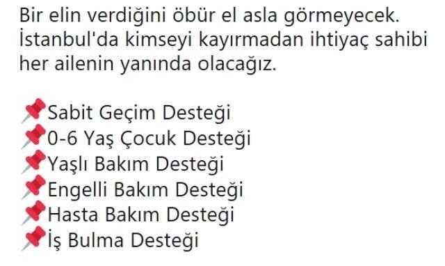Önce, 10 pilot ilçede uygulama acilen başlatılacak, sonrasında tüm İstanbul'da yaygınlaştırılacak. İlköğretim ve ortaokul düzeyinde okuyan öğrencilere, kumanya desteğinde bulunulacak. İhtiyaç duyulan diğer bölgelerde Halk-Süt ücretsiz dağıtılacak. Hiçbir anne-baba çocuğunu okula gönderirken, aç mı açıkta mı kalacak, dert etmeyecek. Öğretim yılı başında ihtiyacı olan 500 bin öğrencinin kırtasiye ve üniforma ihtiyaçları İBB tarafından karşılanacak. Yine aylar öncesinden açıkladığım " ifadelerini kullandı.