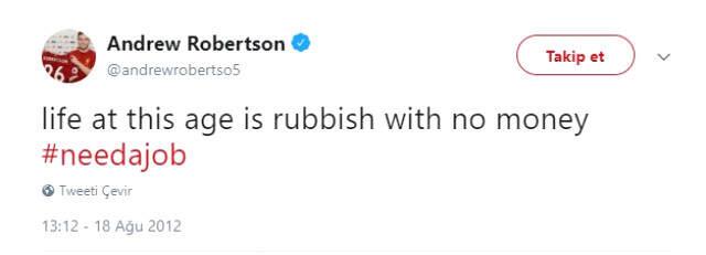 2012 yılında işsizken "Bu yaşlarda parasız hayat bir çöptür" şeklinde tweet atan Liverpoollu futbolcu Andrew Robertson, şimdi Şampiyonlar Ligi finaline çıkacak.