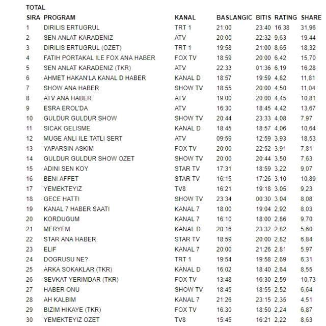 İşte Reyting Listesi: