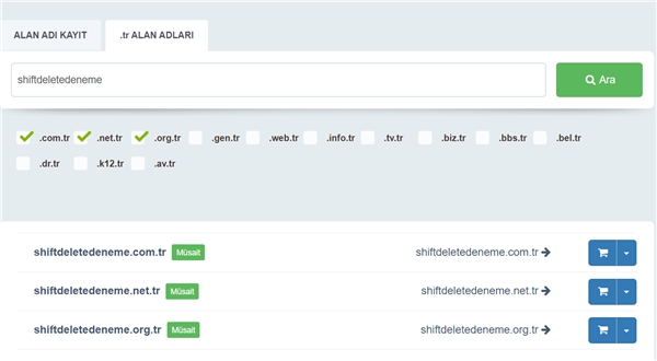 Adım 2: Kaydettirmek istediğiniz alan adını ".tr alan adları" başlığı altında sorgulayın. Eğer boştaysa sepetinize ekleyin.