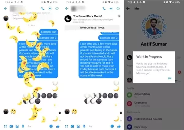 Görünen o ki Facebook, çok fazla uğraştırmadan karanlık modu aktif hale getiren bir özellik ekledi. Yapmanız gereken tek şey, Messenger'da birine hilal ay emojisi göndermek. Ardından gönderdiğiniz hilal ayın üzerine çift tıklarsanız Facebook size karanlık modla ilgili bir soru yöneltiyor ve karanlık moda hızlıca geçmenizi sağlıyor. Bazı kullanıcılarda ise ay emojisini gönderdikten sonra uygulamanın kapatılıp açılması, direkt olarak karanlık modu etkinleştirmeleri anlamına geliyor.