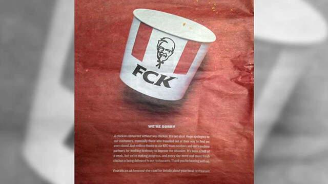 Geçen hafta KFC'nin İngiltere mağazalarında tavuk bitmiş ve gündem olmuştu. Birleşik Krallık'taki 900 mağazadan 800'ü tavuk olmadığı için hizmet verememişti. Restoran zinciri bugün İngiltere'deki gazetelere tam sayfa ilan vererek mağazalarındaki tavuk tükenmesi durumuna karşı özür diledi. Şirket ilanda üzerinde KFC olan tavuk kovalarını kullandı fakat kovanın üzerinde 'beceremedik' anlamına gelebilecek 'FCK' kelimesini yazdı.