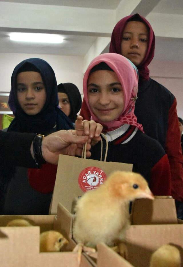 Konya'da karnelerini alan başarılı öğrencilere, bir tavukçuluk firması tarafından sosyal sorumluluk projesi kapsamında ikişer adet civciv dağıtıldı.