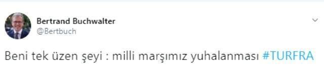 Fransa'nın İstanbul Başkonsolosu Bertrand Buchwalter, bu duruma üzüldüğünü kişisel sosyal medya hesabından paylaştığı mesajla duyurdu. Buchwalter, "Beni tek üzen şey milli marşımızın yuhalanması" dedi.