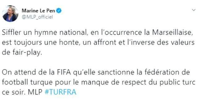 Fransa'nın aşırı sağcı Ulusal Cephe Partisi Genel Başkanı Marine Le Pen de Fransız Milli Marşı'nın Türk seyirciler tarafından ıslıklanmasına tepki gösterdi.