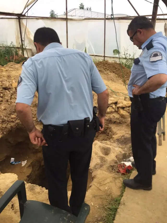 Hemen seranın olduğu yere gelen arazi sahipleri, gördükleri manzara karşısında şoke oldu. Durumun fark edilmesi üzerine serayı kazan 3 kişi ise bir araca binerek kayıplara karıştı. Bunun üzerine arazi sahipleri durumu polise bildirdi. Polis olay yerinde yaptığı incelemede hilti, kazma ve küreklerle sera içerisinde yaklaşık 7 metrelik bir çukurun kazıldığını tespit etti.