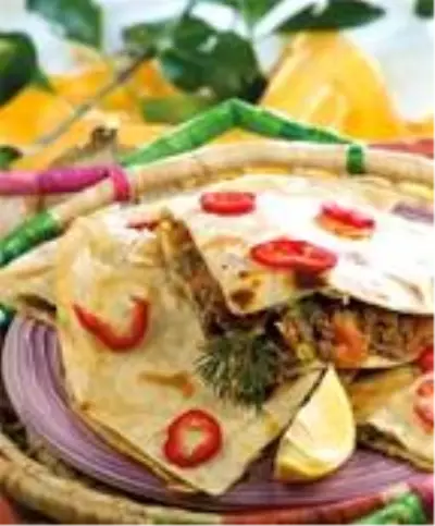 ? 25-30 santim çapındaki teflon tavayı 1 yemek kaşığı sıvı yağla yağlayın. Lavaş ekmeklerden birini tavaya alın. Hazırladığınız içi üzerine yayıp, rendelenmiş dilpeynirini serpiştirip ikinci lavaşı üzerine kapatın. Üzerine bastırıp kısıkla orta ateş arasında 5-6 dakika pişirin. Bir tepsiye ters çevirin. Diğer yüzünü de pişirip ocaktan alın.