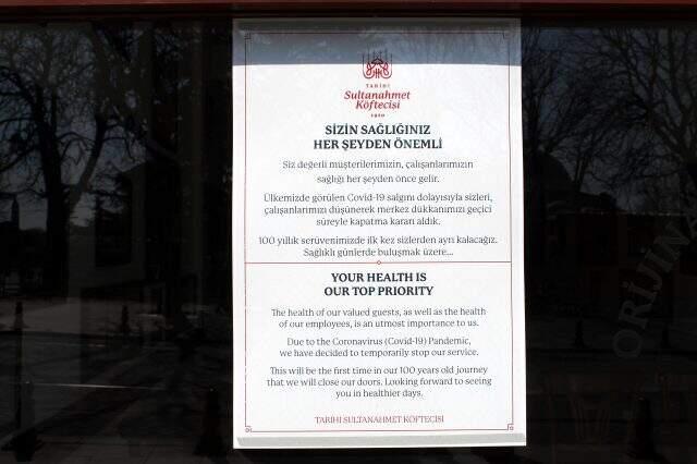 İstanbul'da 104 yıllık Tarihi Sultanahmet Köftecisi, yeni tip koronavirüs salgını nedeniyle geçici olarak dükkanını kapattı. Kapıya asılan notta, "100 yıllık serüvenimizde ilk kez sizlerden ayrı kalacağız" ifadeleri kullanıldı.