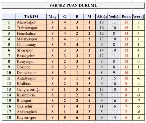 VAR sistemi olmasaydı, ilk 8 hafta sonunda hangi takımların kaç puan daha fazla alacağı ya da kaç puan geride olacağı da Deniz Çoban'ın tablosunda yer buluyor.