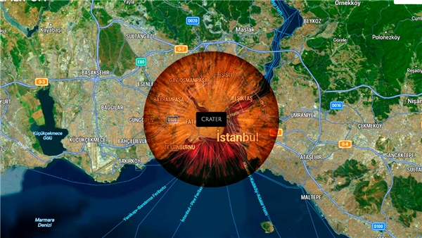 Bu kıyamet senaryosunu İstanbul'a uyarladığımızda; Haliç'e düşecek bir meteorun yaratacağı etkiyi görmüş olduk. 500 metre çapında altından oluşan bir meteorun 45 derecelik açı ile saniyede 17 kilometrelik hızla çarpması durumunda geriye 16 kilometre genişliğinde bir krater bırakıyor.