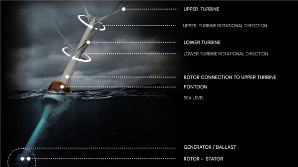 Bu sayede de alt kısımda her şeyin suya düşmesini engelleyecek bir ağırlık eklenmiş oluyor. Görüntülerde de yer aldığı gibi çift yön zıt kanatlara sahip olan dikey türbinlerde stator ve rotor var. Jeneratörün rotoru ve statoru, her biri ana kule şaftından 45 derece açıyla üç kanat çalıştıran çift dikey eksenli türbine bağlanıyor.