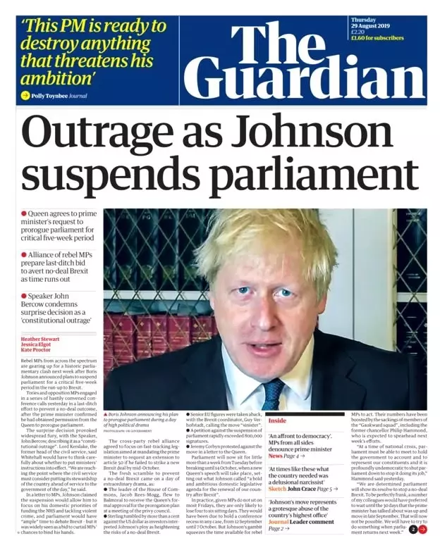 Guardian gazetesi de Boris Johnson'ın hamlesinin İngiltere'de demokrasinin temellerine zarar verdiğini yazıyor. Gazetenin başyazısında "Boris Johnson İngiltere'yi bir anayasal krize sürüklüyor" deniyor: