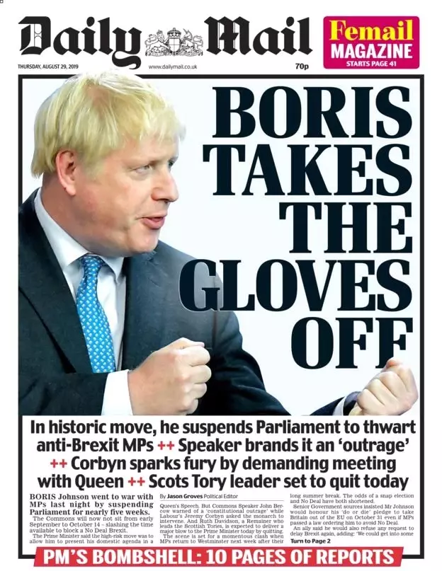 Brexit karşıtı tutumuyla bilinen Guardian gazetesi 'Johnson'ın parlamentoyu askıya almasına isyan' manşetiyle çıkarken, ülkenin en yüksek tirajlı gazetesi Brexit yanlısı Daily Mail ise 'Johnson eldivenleri attı' başlığını manşete taşıdı.