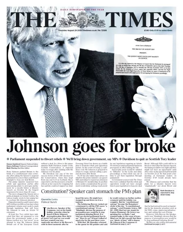 Times gazetesinin başyazısında ise "Johnson radikal bir karar aldı ve muhalefetin sert tepkisiyle karşılaştı. Her ne kadar büyük bir tepki yüksek sesle dile getiriliyor olsa da, alınan karar anayasaya aykırı değil" deniyor: