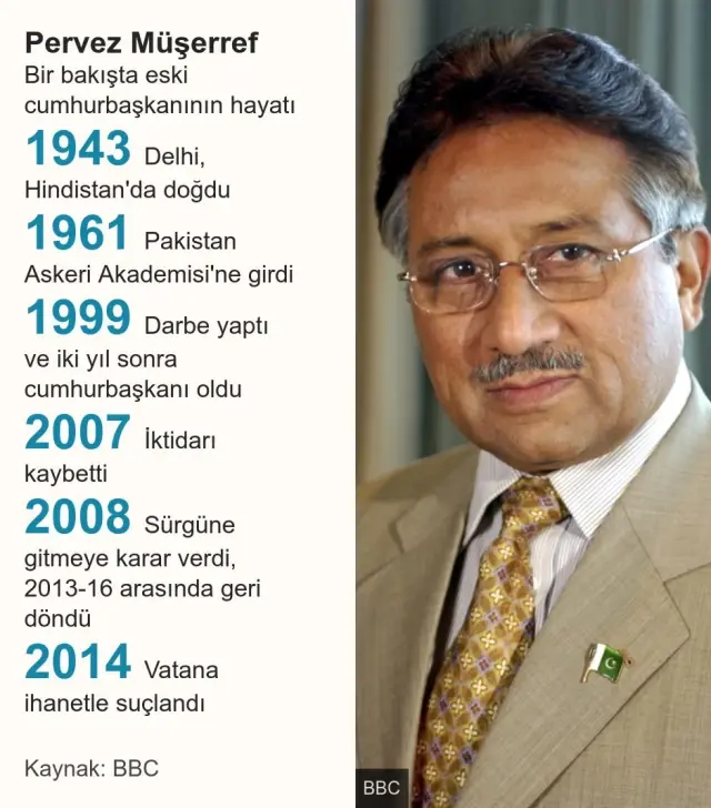 Hakkında açılan davalar nedeniyle Pakistan'ı terk eden Müşerref, 2016 yılından bu yana Dubai'de yaşıyor. Birkaç hafta önce sağlık sorunları nedeniyle hastaneye kaldırılmıştı.