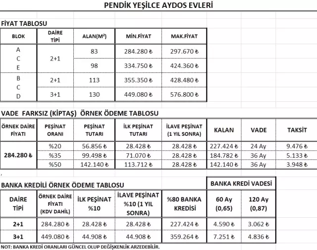 Özel lokasyonu ve orman manzaralı daireleriyle dikkat çeken projede, geniş balkonlu 2+1 ve 3+1 daire seçeneklerine yer veriliyor. Sakin ve huzurlu bir yaşam projesi olarak uygulamaya geçirilen Yeşilce Aydos"ta 2+1 daireler lansman dönemine özel 284 bin 280 TL"den, 3+1 daireler ise 449 bin TL"den başlıyor. Büyüklükleri 83 metrekare ile 130 metrekare arasında değişen projede toplam 331 daire yer alıyor. KİPTAŞ imkanlarıyla 36 ay vade farksız ödeme seçeneği sunulan projede ayrıca yüzde 10 peşinat ile 120 aya kadar da anlaşmalı bankalar aracılığıyla kredi imkanı da sunuluyor.