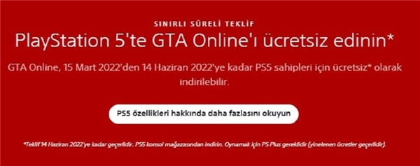 GTA Online, 15 Mart-14 Haziran tarihleri arasında PS5 için ücretsiz. Oyuncular, bu süre zarfında PS5 Konsol Mağazası'ndan indirmeleri halinde yapımı ücret ödemeden sonsuza dek oynama imkanına sahip olacak. Ancak yine de PS Plus ücretlerinin ödenmesi gerektiğini belirtelim.
