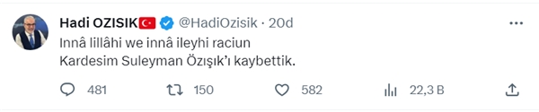 Hadi Özışık, sosyal medya hesabı üzerinden acı haberi, "Inna lillahi ve inna ileyhi raciun... Kardeşim Süleyman Özışık'ı kaybettik." notuyla duyurdu.