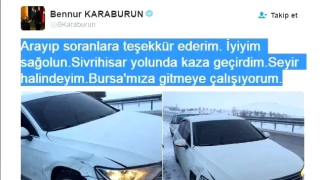 AK Parti Bursa Milletvekili Bennur Karaburun Ankara’dan Bursa’ya dönerken trafik kazası geçirdi.