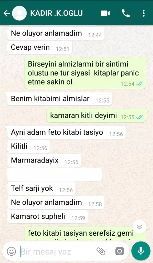 İskenderunlu denizci Kadir Köroğlu, çalıştığı gemide FETÖ kitaplarını okuyan şüpheli personel olduğunu ve kamarasına izinsiz girdiğini Whatsapp'tan dayısına bildirdikten sonra ortadan kayboldu.