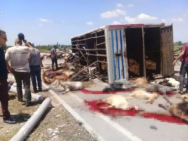 Adana'nın Ceyhan ilçesinde, sürücüsünün kontrolünden çıkan TIR'ın devrilmesi sonucu yaklaşık 60 küçükbaş öldü.