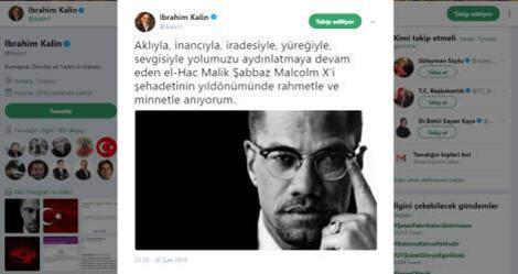 Cumhurbaşkanlığı Sözcüsü İbrahim Kalın, Twitter'daki sosyal medya hesabından yaptığı açıklamada, 21 Şubat 1965'te suikasta kurban giden, ABD'de ırkçılıkla mücadelenin sembol isimlerinden siyahi Müslüman lider Malcolm X'i vefatının yıl dönümünde andığını belirtti.