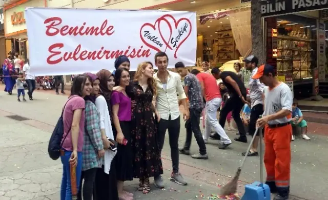 Kocaeli'nin İzmit ilçesinin en kalabalık yerlerinden biri olan Fethiye caddesinde bir genç, 5 yıldır birlikte olduğu kız arkadaşına yüzlerce kişinin arasında evlilik teklifi yaptı. Cadde ortasına astığı pankart önünde birlikte olduğu Şevkiye Terzi'nin önünde diz çökerek yaptığı tekliften "Evet" cevabı alan damat adayı Volkan Bal, teklif sonrası bir sürprizi de kendisi yaşadı. Teklif sırasında patlatılarak yerlere dökülen konfetileri temizlemeye gelen belediye görevlisi Ayhan Poyraz, damat adayına ceza vererek kirlettiği yerleri temizletti. Temizlik görevlisinin elindeki süpürge ve küreği alan damat adayı Volkan Bal, aldığı "Evet" teklifi sonrası gelen cezanın kendisine ödül gibi geldiğini ifade etti.