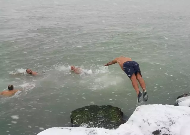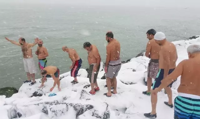 İstanbul'da kar yağışı aralıklarla devam ederken, sıcaklığın sıfırın altında 5 dereceyi gösterdiği bugün kendilerini "Sarayburnu Fatihleri" olarak adlandıran bir grup, buz gibi soğuğa karşı denize girdi. Grup üyelerinden bazıları zaman zaman da kara yattı.