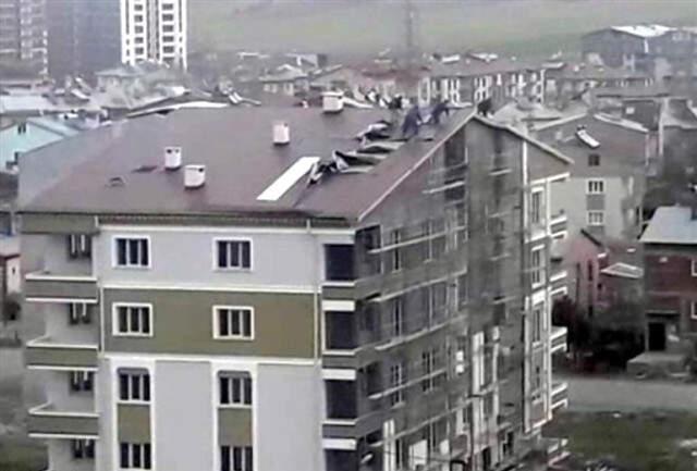 Öte yandan rüzgar kent genelinde de binalarda da hasara yol açtı. Alibaba Mahallesi'nde henüz inşaat halindeki 5 katlı bir apartmanın çatı kaplama malzemeleri rüzgarın etkisiyle yerinden kalktı. Bu sırada çatıya çıkan işçilerin, kopmak üzere olan parçaları tutmaya çalıştıkları görüldü.
