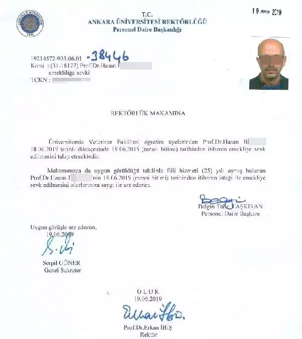 Emeklilik dilekçesine, aynı gün Rektör Prof. Dr. Erkan İbiş'in imzasıyla 'olur' verildi. Rektörün onay yazısının eklendiği dilekçe, yine 19 Haziran'da Rektör Yardımcısı Prof. Dr. Ayşen Apaydın'ın imzasıyla ilgili dağıtım yerlerine gönderildi. Rektörlüğün onayını alan Veteriner Fakültesi Dekanlığı'nca öğretim üyesinin bağlı olduğu Cerrahi Ana Bilim Dalı Başkanlığı'na gönderilen 20 Haziran 2019 tarihli yazıyla Hasan B.'nin emekliye sevk edildiği bildirildi. Prof. Dr. Belgin Sarımehmetoğlu'nun imzaladığı yazıda, "Ana Bilim Dalınız öğretim üyesi Prof. Dr. Hasan B'nin, 18.06.2019 tarihi mesai bitiminden itibaren kendi isteği ile emekliye sevk edildiğine ilişkin, Ankara Üniversitesi Rektörlüğünden alınan 19.06.2019 tarihli ve sayılı yazı ekte gönderilmiştir" denildi.