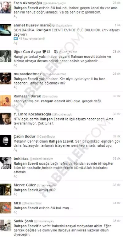Rahşan Ecevit'in ölümüyle ilgili bir iddia, başta twitter olmak üzere sanal alemde ışık hızıyla yayıldı.